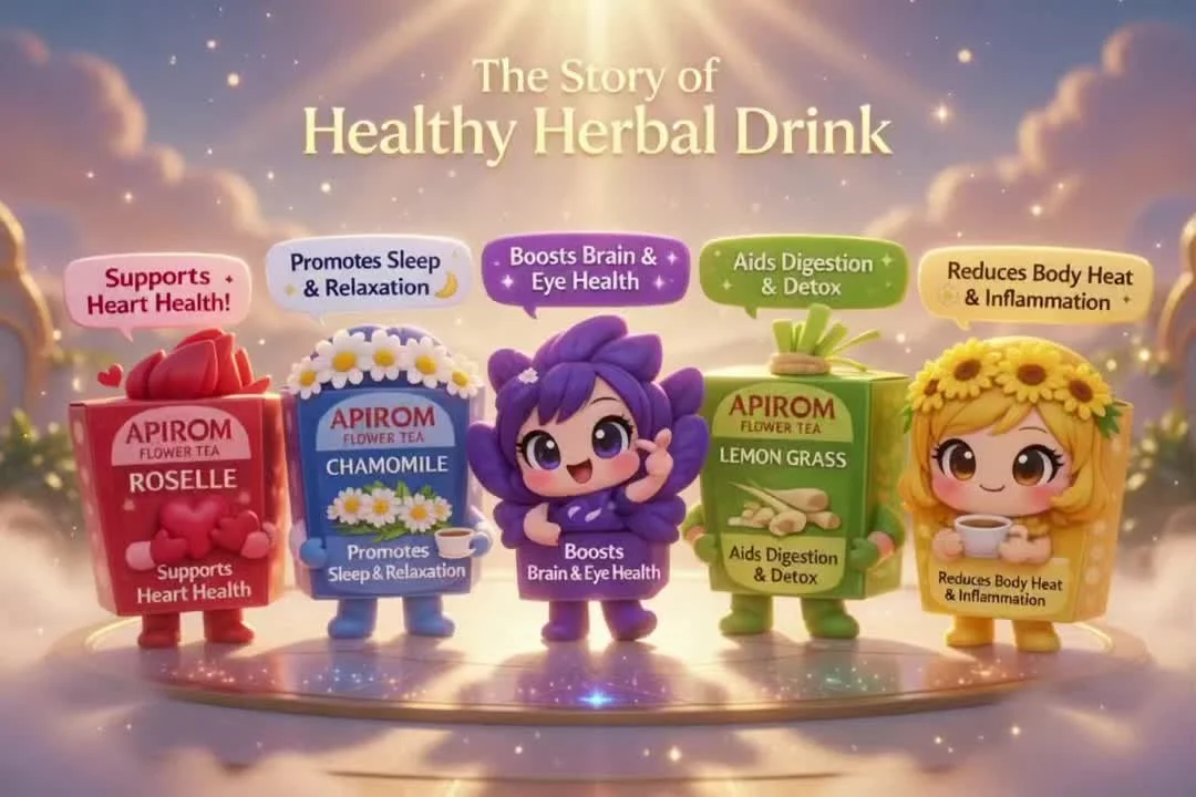 Chamomile, Chrysanthemum, Roselle, Butterfly Pea, Lemon Grass, Ginger, Bishop Rose